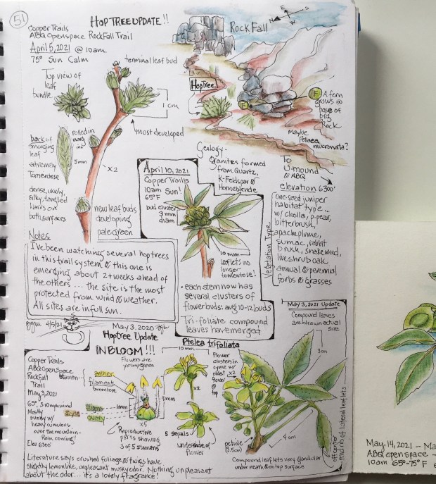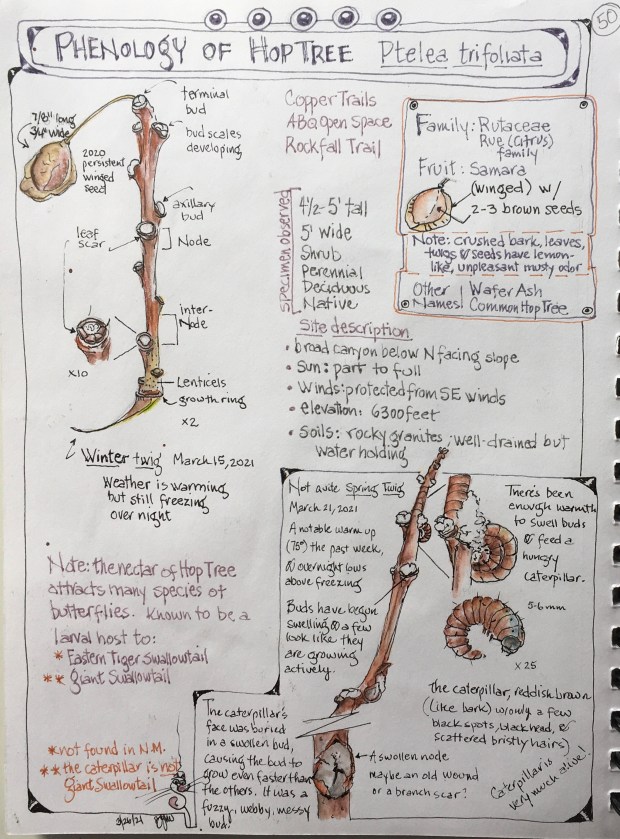 Hiking up into our favorite side canyon in the Copper Trail system, brought us to one of my favorite ”trees” that I’ve been monitoring for several years; the Hop Tree (aka wafer ash). More like a big shrub rather than a tree, this particular plant is snuggled against a protective hillside just west of a beautiful rockfall. The cool and moist rocky setting seems to be just perfect for the hop tree and about 20 nearby relatives to flourish year after year. Last year at this time the buds were beginning to swell. Yesterday (March 26th) there was only a hint of green.