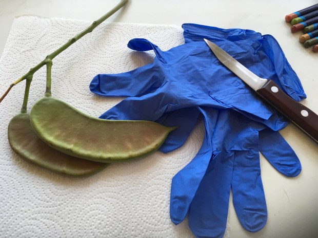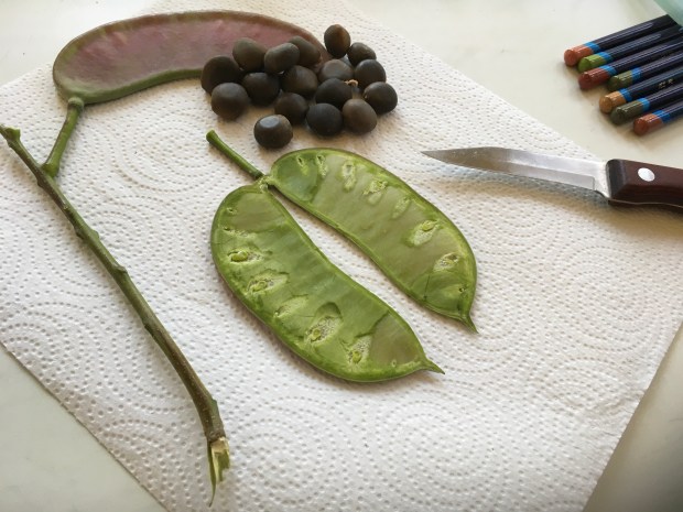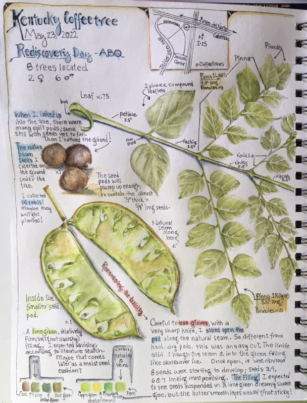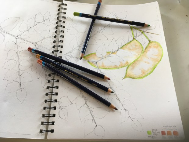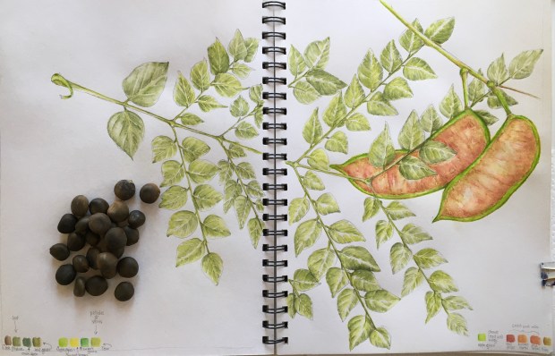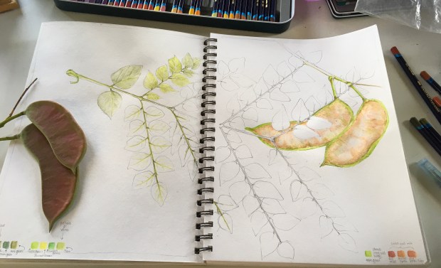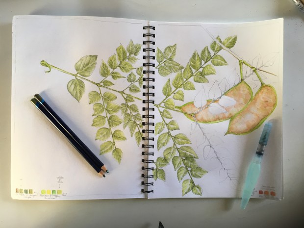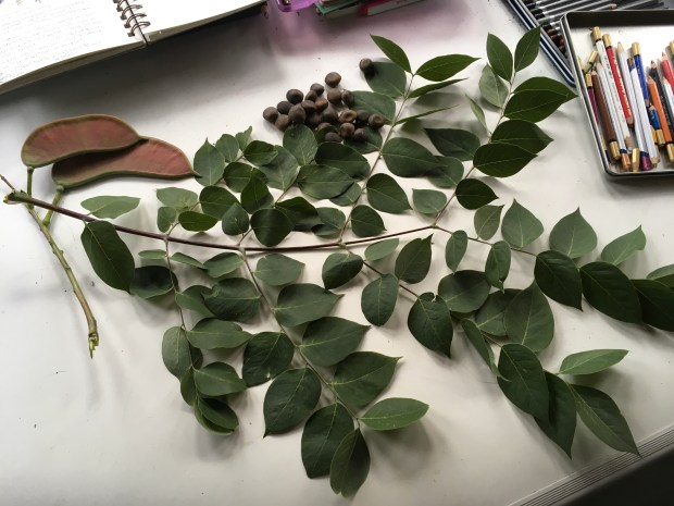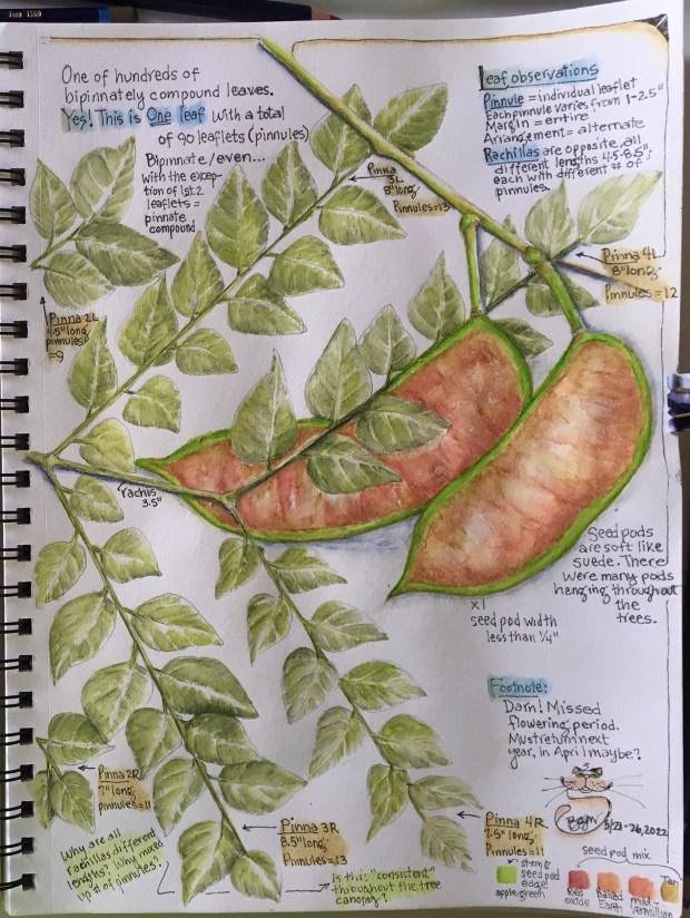 Caught without my sketchbook (shame on me), I took lots of photos of the trees, the bark on the trunks, leaves and fruit. Then, not thinking one of the female trees would mind, I popped off a 14“ long bipinnate compound leaf and a pair of new seed pods.