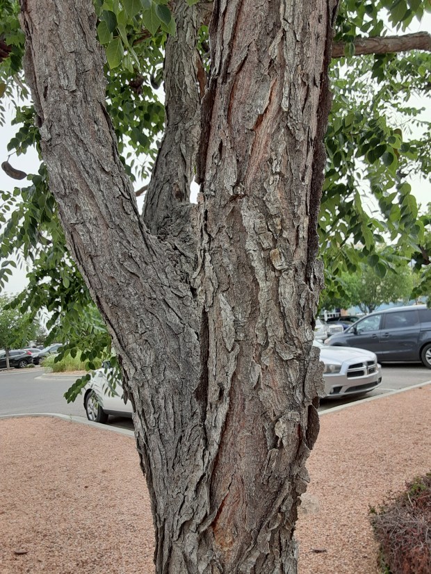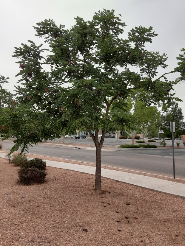 As luck would have it, I found myself once again in northABQ with a bit of quality time on my hands, so Luna and I set off on the 2 mile round-trip walk to revisit my beloved Kentucky Coffeetrees. It was a rediscovery of sorts and a surprise to find the 2 female trees had progressed way beyond blooming! Fully leafed out, they were showing off newly developing, soft as suede seed pods!