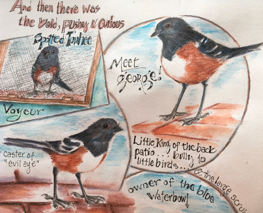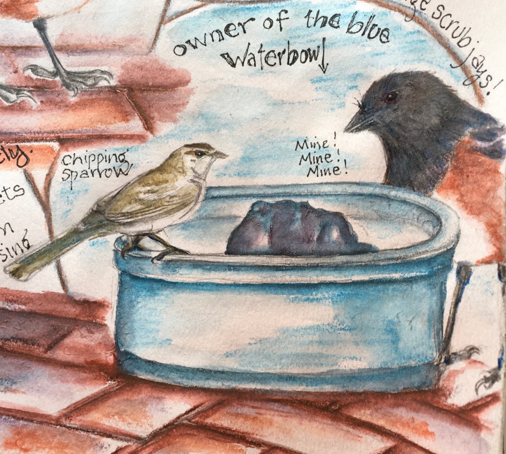 One day George decided to visit me on a windowsill outside my studio. I waved, but then he quickly flew over to the patio and staked his claim on the waterbowl. “How dare that cheeky chipping sparrow take a sip!”