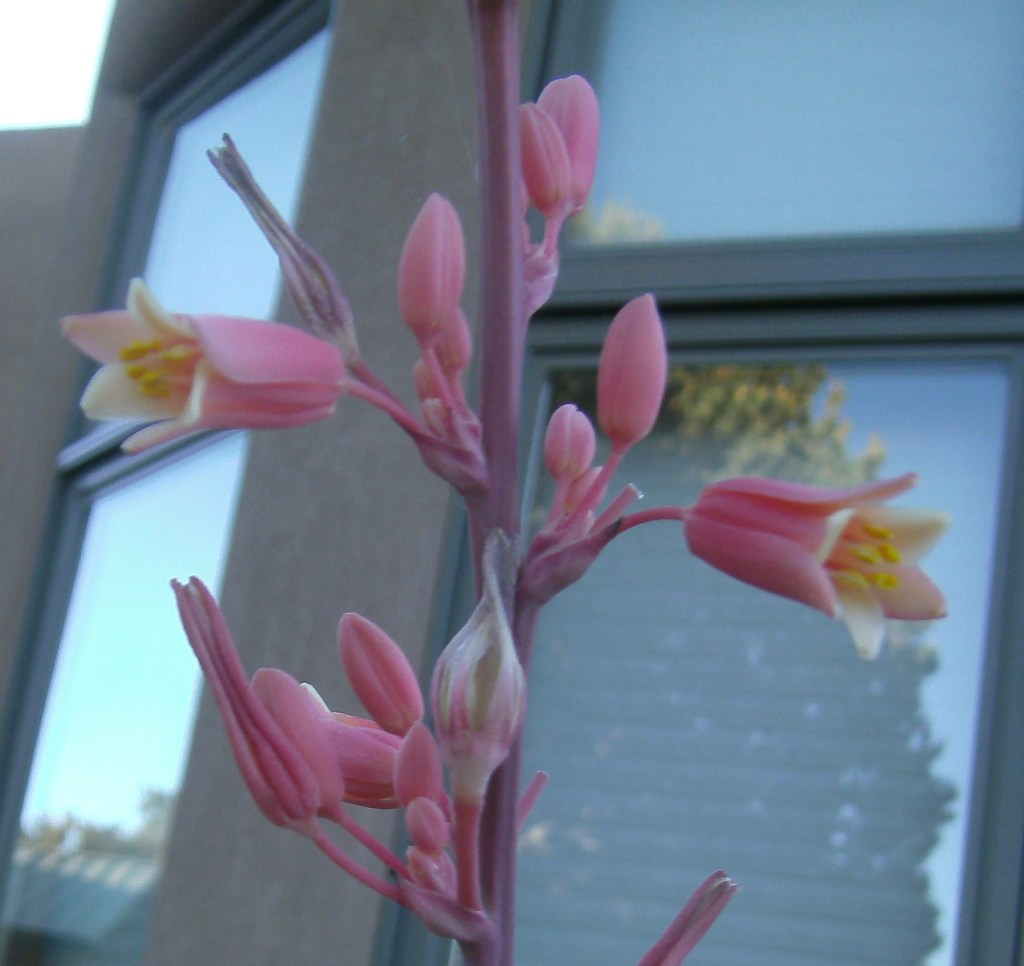 Flowers of the Red Yucca (Red Hesperaloe) opening along the 6 foot tall flower stalk.