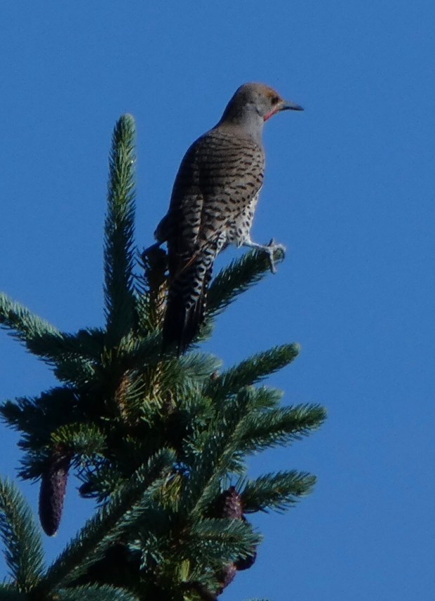 Northern Flicker: The Northern Flicker is truly a woodpecker, but with a strange habit. Instead climbing up and around trees hammering away looking for food like a ”normal” woodpecker, the flicker prefers to eat on the ground, grubbing about in search of their favorite insects …. ants and beetles. But as this photo shows, flickers do get high! They don’t assume the typical woodpecker stance of using their tails to prop against a tree trunk, but perch from a prime vantage point to call quite loudly to proclaiming their territory. When they aren’t being territorial, they use their loud calls as a form of friendly communication.