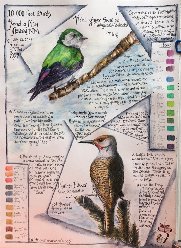 1. I love your gorgeous pages and the vibrant colors! The swallow is amazing, I have not seen one of those before. I really love how you put diagonal boxes for your sketch and the information around it. Did you pencil that in before writing your information? Northern flickers are common here too and I love seeing them on our grass. One day I heard pecking on our house and I snuck outside and discovered a flicker pounding on our metal downspout noisily! An interesting fact about flickers in eastern US is that they have yellow underneath their wings instead of the pinkish-orange color here. My Dad in Ontario, Canada told me about this color difference as he got to observe one that had hit a window in his apartment building. I had no idea that flickers were different colors on either side of the country! Thanks for sharing your discoveries on Sandia Peak!