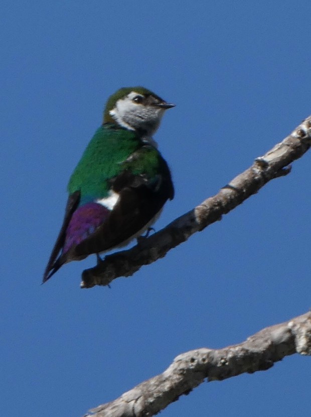It was not until one of the swallows would alight on a tree branch that we noticed, with awe, their dazzling coloration. The morning’s bright sun reflected off iridescent green/copper, iris and cobalt blue, and shimmering violet feathers. It was breathtaking!