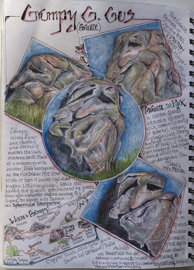 Sandia Mountain granite! Such distinctively gnarly gargoyles, whimisically odd and judgmental, critter and caricature mimics ……. There’s nothing like these boulders! This is a short story about one of a cast of thousands; Grumpy G. Gus.