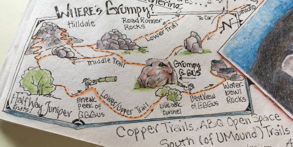Sandia Mountain granite! Such distinctively gnarly gargoyles, whimisically odd and judgmental, critter and caricature mimics ……. There’s nothing like these boulders! This is a short story about one of a cast of thousands; Grumpy G. Gus.