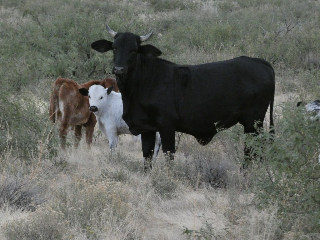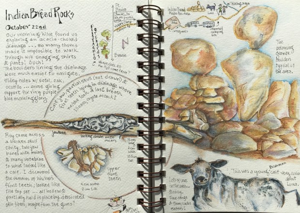 To access Indian Bread Rocks (maybe the name came from the big loaf-shaped boulders?), you must first pass by a few miles of pistachio orchards looking ready to harvest. Wonder where the irrigation water for these big trees comes from way out in this desert? We then made a southwest turn onto a gravel road (Happy Camp Canyon Road) and in 3 miles we arrived at the designated Indian Bread Rocks picnic area, “sandwiched” between extremely large boulders. No camping here tho … so we continued on up the deteriorating two track road, pushing bawling cows out of our way. These free-range Brahman bulls, cows and calves turned into camp visitors after we set up about 3/4 mile beyond the picnic area.