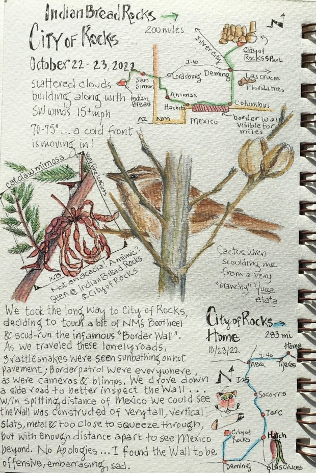 We usually know where we’re headed in the morning, but how we get there is another story. As we left Indian Bread Rocks we talked about optional routes to reach our destination …. City of Rocks State Park. There were several choices, and since we’re not interstate highway fans (unless absolutely necessary) we opted for the road less traveled; through New Mexico’s “Bootheel” in the extreme southwestern part of the state. Going this way we might just catch a glimpse of that infamous Border Wall too.