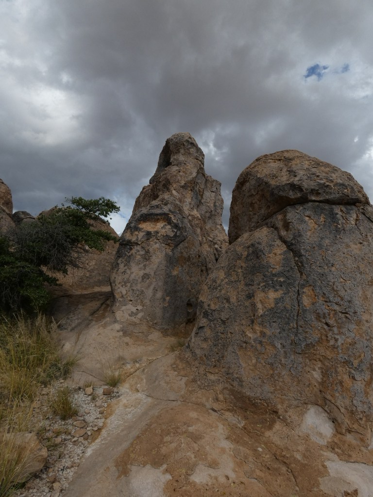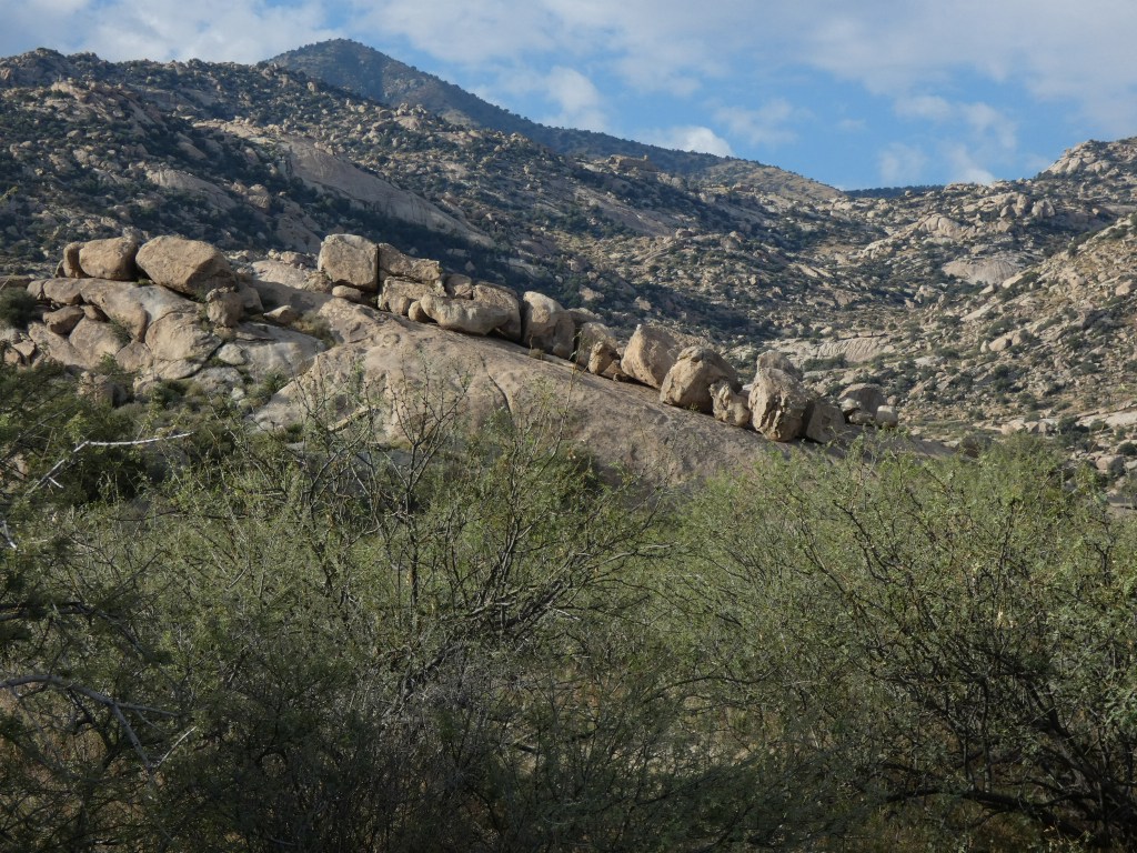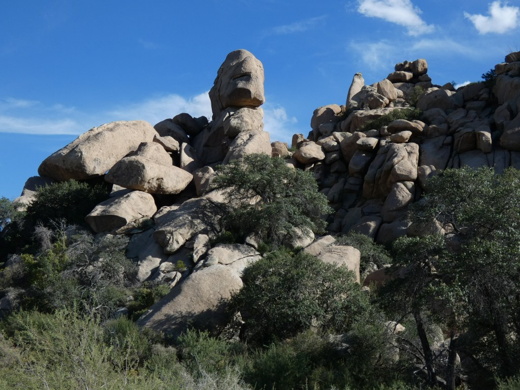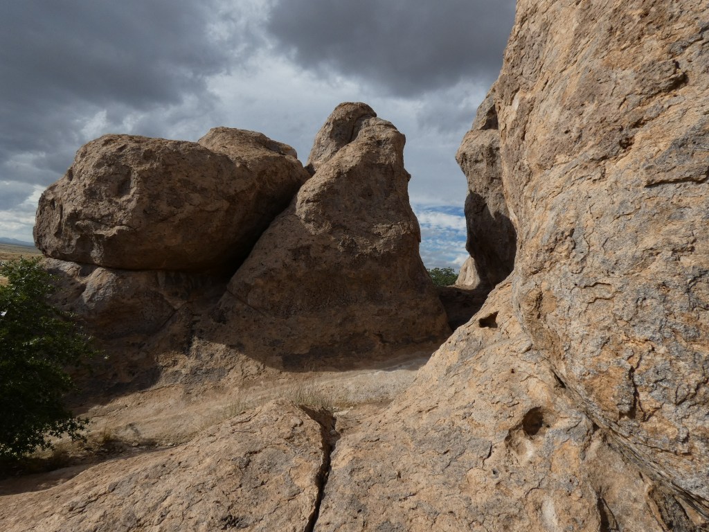 Another short (96 miles) drive took us from Clifton, through Safford (to find ice cream ….. it’s getting warm!), and then south of the nearly deserted town of Bowie to visit a sprawling garden of giant granite boulders called Indian Bread Rocks. We seem to find the most amazing collections of boulders and rocks around, and this area didn’t disappoint. Unable to find out the origin of the name “Indian Bread Rocks,” this new-to-us recreation area sits in the foothills on the northeast fringes of Dos Cabezas Mountains Wilderness Area …. both areas managed by Bureau of Land Management (BLM). Public lands “Rock!”