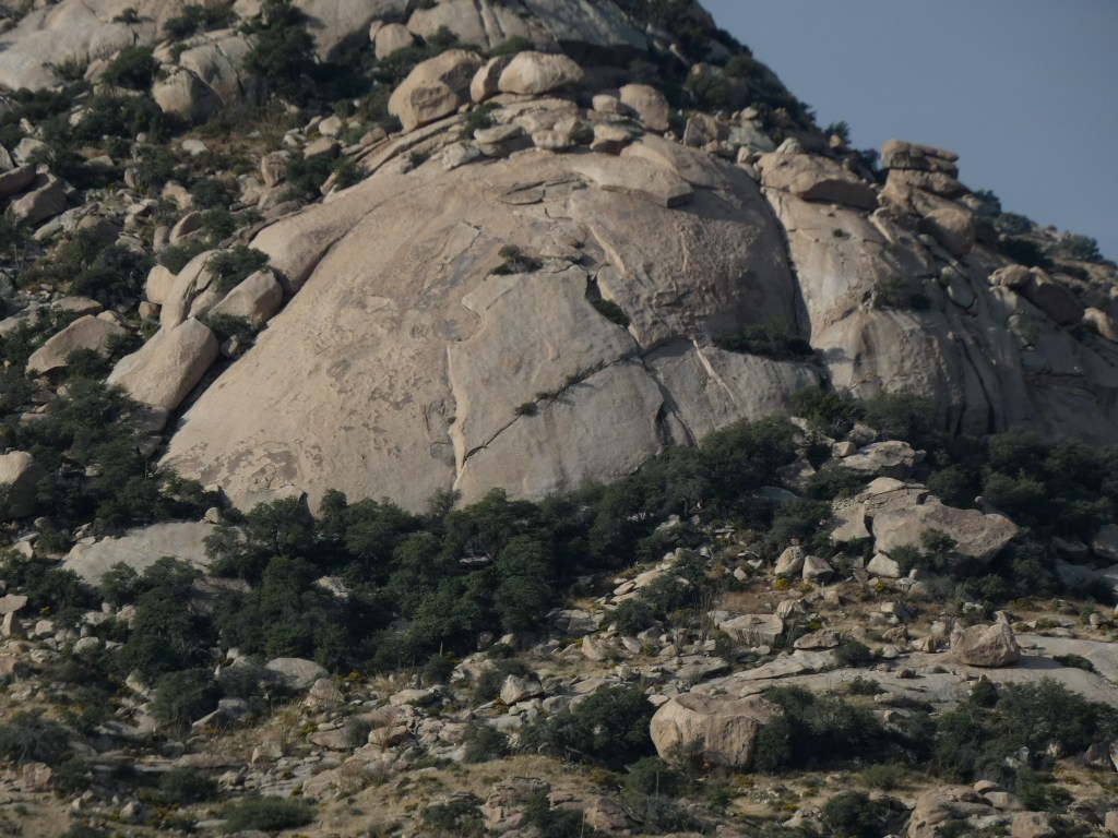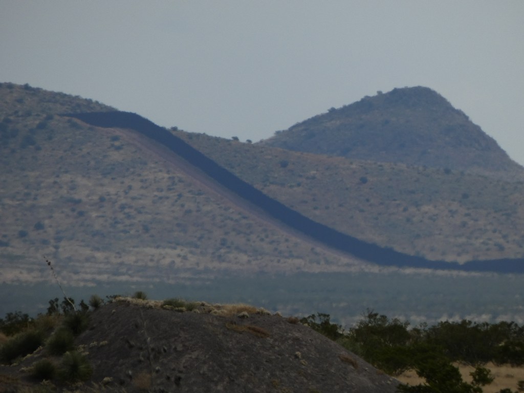 Although this route was the long way to City of Rocks (200 miles versus 110 miles), it was definitely eye-opening. As we traveled lonely roads, dodging no less than 3 huge rattlesnakes sunning themselves on the pavement, the only vehicles we saw were border patrol. It was windy and hot as we approached the Mexican border, and we strained our eyes to see something resembling a Wall off in the distance. Between Hachita and Columbus, NM, we could make out what looked to be a RR bed in the valley bottom. Binoculars weren’t much use, as this very straight line wasn’t resolving into a Wall, until ….. all at once we saw the RR track climb straight up a pretty substantial hill. That answered the question …. that faux track was indeed the Border Wall, and we had already seen miles and miles of it.
