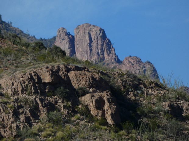Indian Bread Rocks plants consist of Chihuahuan desert species with impossible-to-navigate and tire penetrating thorned mesquite, and 6 foot tall spiny prickly pear choking the valley floors. But up small riparian areas (mostly dry washes where water may flow during the monsoon season) we found large oak trees, ocotillo, intermittent water dependent mesquite and cat claw mimosa, sotol and many other shrubs, wildflowers, ferns and grasses. We didn’t hear many birds, but they were around, and we found an assortment of insects (grasshoppers, true bugs, beetles and wasps) flying, hopping and snacking on desert plants.