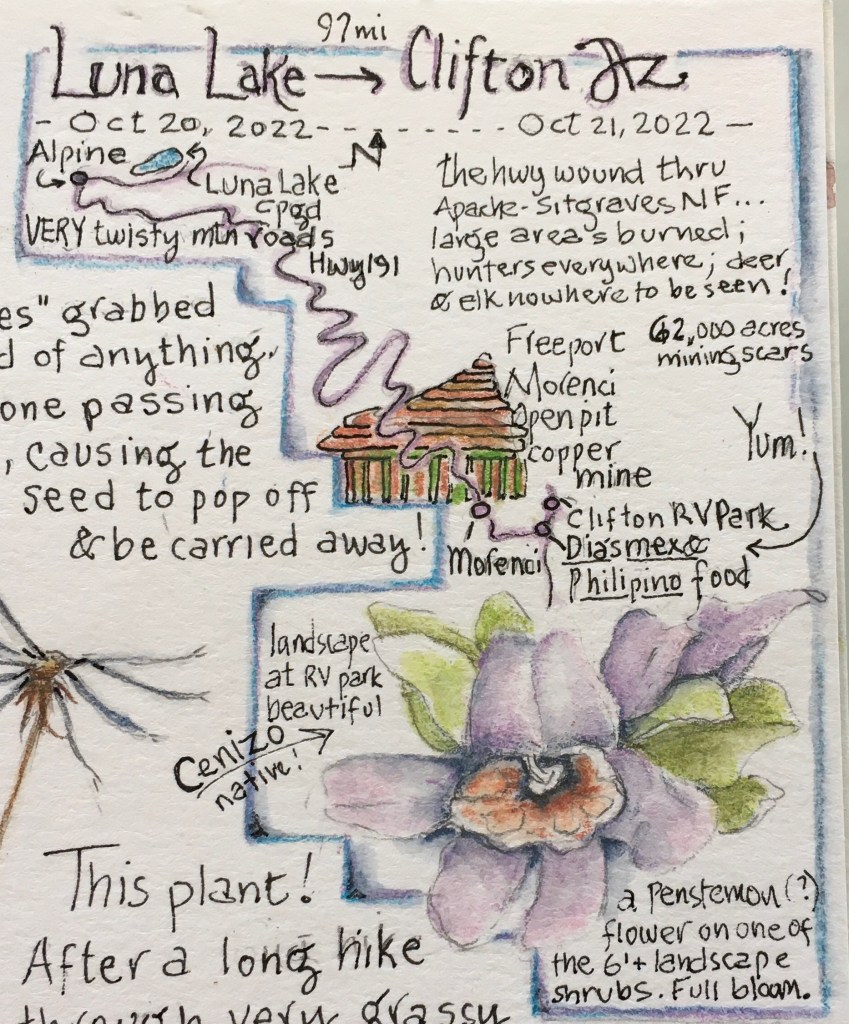 Even though we had a mere 97 miles to travel today, we knew the road would be long and winding, up and down, as we dropped over the Mogollon Rim at 8000 feet to the Northern Chihuahua desert at 4000 feet. And yes indeed, it was a slow go, but worth the drive as we passed through the Apache-Sitgraves National Forest. This dry forest, dominated by old growth ponderosa pine, had recently burned in many places turning visually impenetrable mountains into scenic, long distance views. As we neared the town of Morenci towards the end of our day, the country literally fell apart due to a gigantic open pit copper mine. We passed by the remains of leveled mountains reconstructed with overburden, impossibly deep terraced pits, and parades of the largest dump trucks ever, carrying freshly blasted raw materials to be processed into copper plates. Morenci is Freeport’s flagship copper mine (Freeport is part of a gigantic international mining conglomerate) and at 62,000 acres in size, there’s every indication of continued expansion. Wow.
