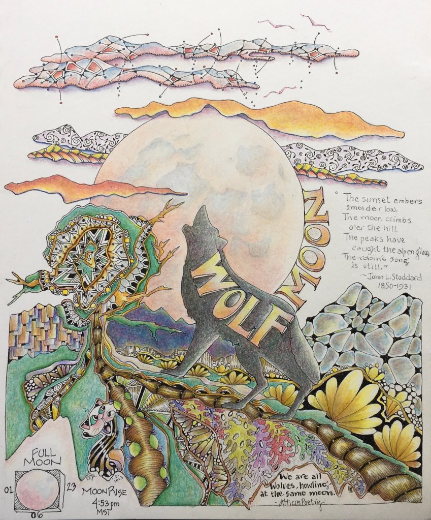 2. Fantastic information about the moon! I always learn so much in your posts (I’m going to forward this one to my mom as she loooooves the moon!) and love your incredible zentangle — and the Stoddard poem is lovely! 2 nights ago, we had not wolves howling at the moon, but coyotes barking and yipping so loudly right in the back of our property! We went out and I caught them on video, well at least recorded the sound. We stood at the back fence looking down into the blackness of the forest and up at the clear, nearly full moon and it was so magical!