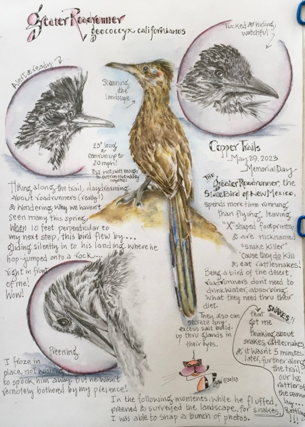 Well, about a dozen or more photos later, it was time for me to resume my hike and catch up with Roy and Luna. I excitedly shared my encounter and photos with them (Luna wasn’t impressed) and wondered again, out loud, why we haven’t seen any rattlesnakes yet. Surely that roadrunner was hungry.