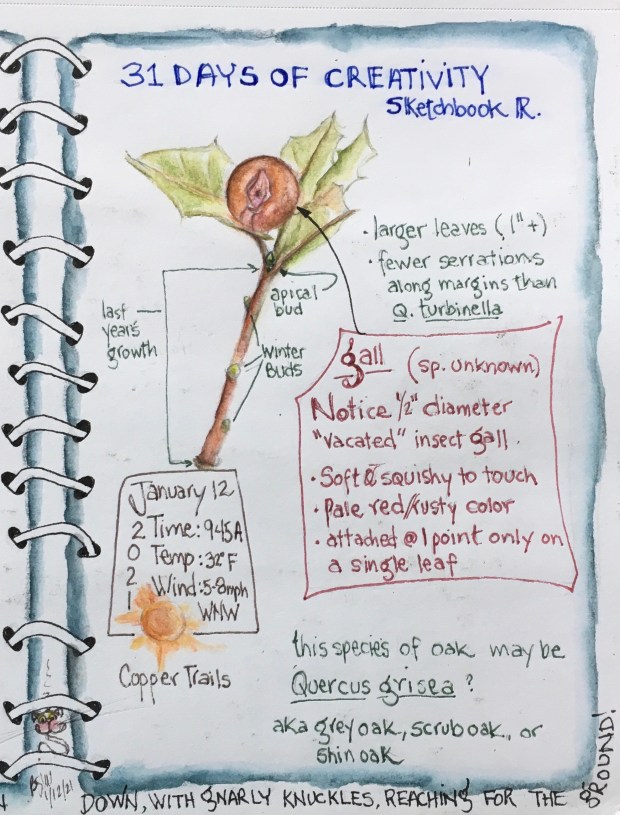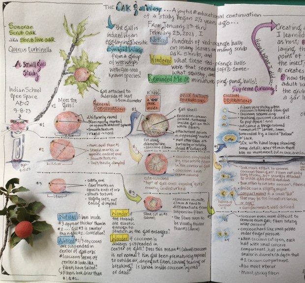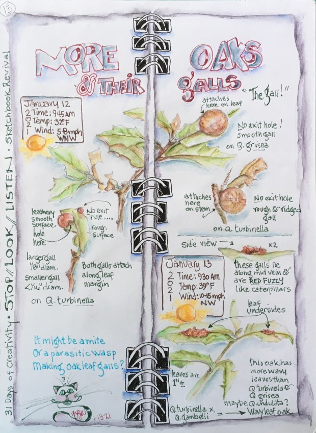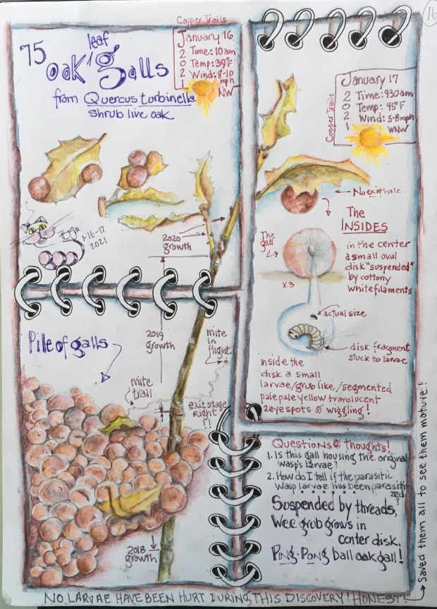 I’m still looking for the answers to these questions, along with the many questions that arose while examining these large oak galls (many questions didn’t make it to my journal pages, but are tucked into my field notebook to revisit in the coming years).