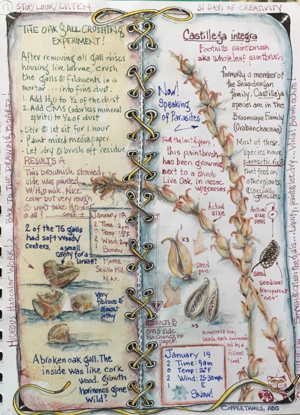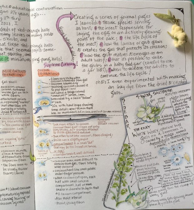Wow, Barb — what a curiosity journey into the galls! I am curious about why they are red. I don’t seem to see that many around here. How interesting are the Saltbush fluffy galls! I am enamored with the sketches of the laced binding and ring binding on your journal pages. I admire your curiosity and investigation paths — I was reminded of you in a Wild Wonder session on Whimsical and Imaginative sketchbook adventures — your amazing zentangle creations and how Flambe’s cute face adorns each page that you create. So enjoyable!