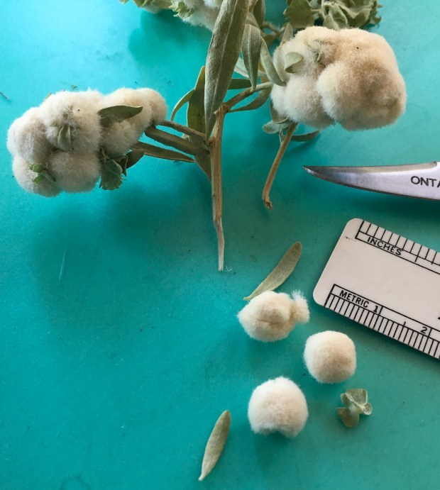 So my “little study” has grown, and even expanded to include a branching-off project loosely related to oak galls ….. the now obvious-to-me insect gall found on four-wing saltbush. Funny story …… Last year I thought a “four-wing” had been profusely decorated by a group of trail running, bubble gum chewing kids (I honestly envisioned that when the team stopped to catch their breath, before drinking a swallow of water, they each removed the wad of gum from their mouths and stuck them all on the same shrub! Really! That’s what I thought!). After passing by the same shrub numerous times, I decided to see just how sticky all of that bubble gum still was. Slowly and oh so gently my hand reached out and, whoa! No way! Not sticky, but the exact opposite ….. they were incredibly soft and white wooly, shaped like little puffy ear buds, and seemed to grow together in large clumps. And wouldn’t you know it ….. just within the last several weeks I noticed many four-wing saltbush shrubs nearly covered with extra large clumps of these galls. Could this exaggerated clump size be caused by the same weird, weather-related trigger resulting in the extra large oak galls too? Worth pondering, don’t you think? A mystery to solve another day.