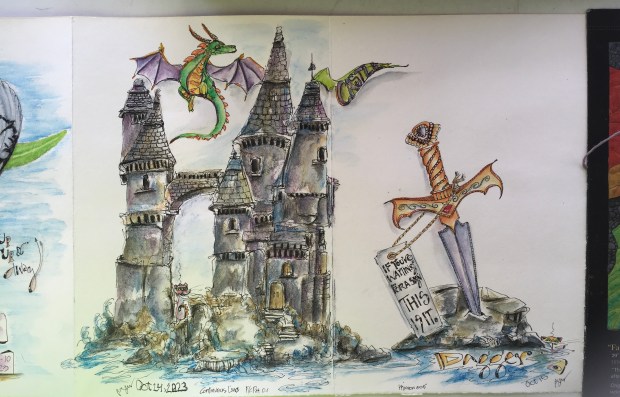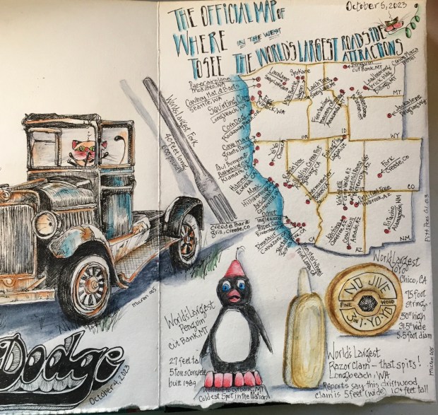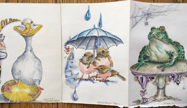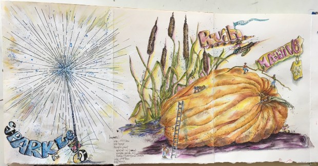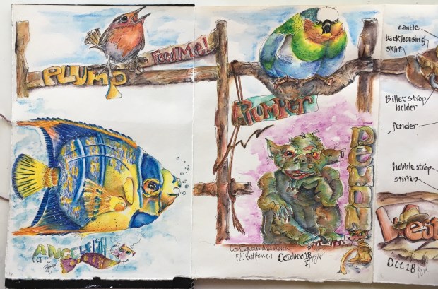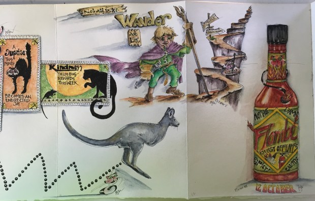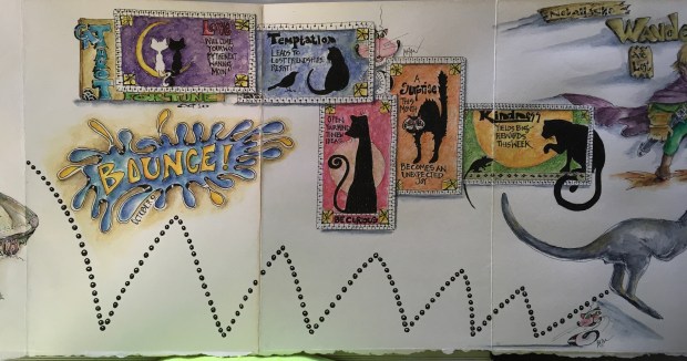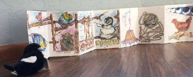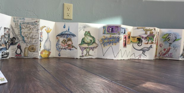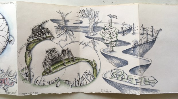 Each 9×6” page of my accordion book are chock full of inked and painted illustrations with touches of humor, drama, realism, mystery, whimsy and a touch of fantasy. It was great fun stretching my imagination, but I’m happy to be finished (at least until Inktober 2024).