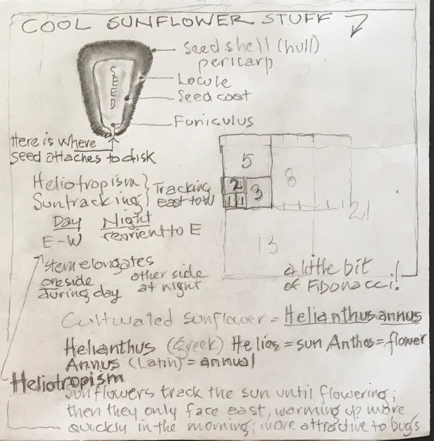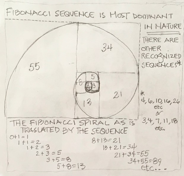 So is it possible to ever become the most efficient sunflower seed generator ever? How many spirals would be needed to achieve this goal, if it is achievable? Since the Golden Ratio is an irregular number (never ending), perhaps it’s not possible, but it would be cool to know how close it could get before undeveloped buds and/or seeds began spilling out of the sunflower head! If the Golden Ratio is irregular, maybe there’s no limit to the size to which a sunflower head can grow? Who, if anyone, knows these things? Would this be important somehow (unlimited quantities of sunflower seeds to feed the world or at least all of the birds in the world)? Does Carrying Capacity enter into this possibility like it does with animal populations? Thoughts for another day.