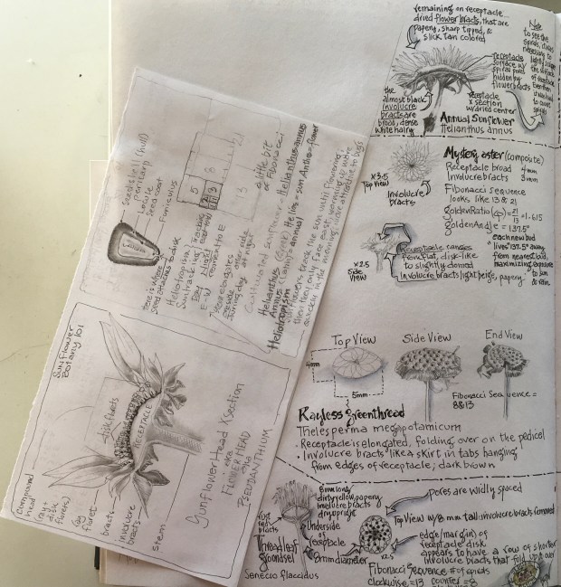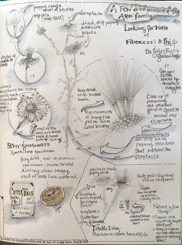 Today, I’m merely wondering if each species in the family Asteraceae has its own constant number of Receptacle disk spirals (which, by the way = the Seed Head), along with other characteristics that are species specific? And can you identify a species by counting spirals and Receptacle disk size, shape, color, and/or depth of disk dots?!