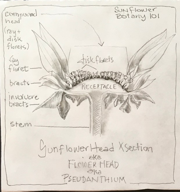 All of the florets are supported on a structure called the Receptacle. A spongy layer of material, typically growing in the shape of a disk, the Receptacle often flexes in shape from convex to flat to concave, depending on the stage of floret maturity. Underneath the Receptacle is a protective ring of leaf-shaped bracts called the Involucre, which can be down- or up-curved, fleshy or stiff and papery, depending on stage of floret maturity. This had me wondering if it was possible to identify a species by its Receptacle shape and Involucre characteristics? Hmmmmmm???????
