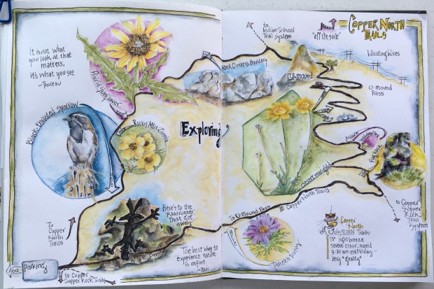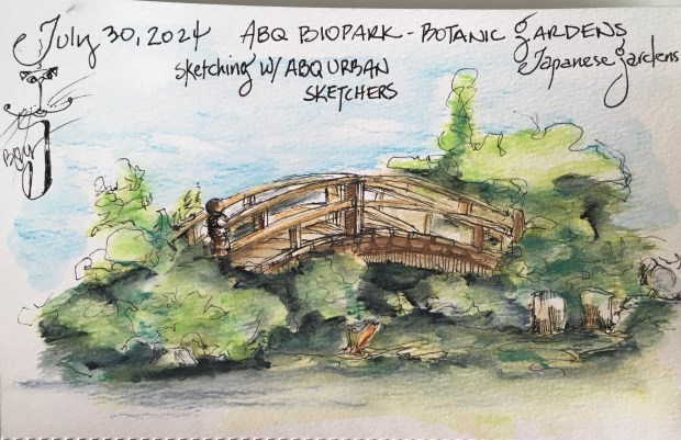 On July 30th, six of us Albuquerque (ABQ) Urban Sketchers gathered for an impromptu morning of exploring and sketching at the ABQ Biopark/Botanic Gardens. It’s always so much fun seeing what’s blooming any time of the year, even during the heat of summer. Despite the morning’s toasty hot temperatures, the plentiful shade and water features provided many “cool” locations for sketching and exploring.