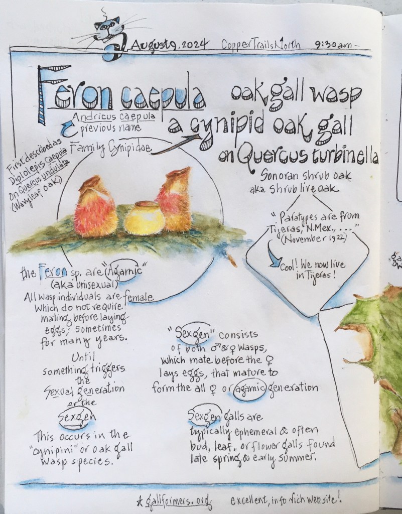 Originally identified in a 1926 field report as a new species, Diplolepis undulata, this species’ name was reestablished as Feron caepula in a report published in 2023. Ordinarily I choose to only cite a field report, but decided to make an exception in this case for several reasons…… the description of this new species was helpful in better understanding my specimens, and……. one of the paratypes used to describe the new species came from Tijeras, NM (which happens to be my home!). So the entire 1926 field report* (surprisingly short) by LH Weld is added below.