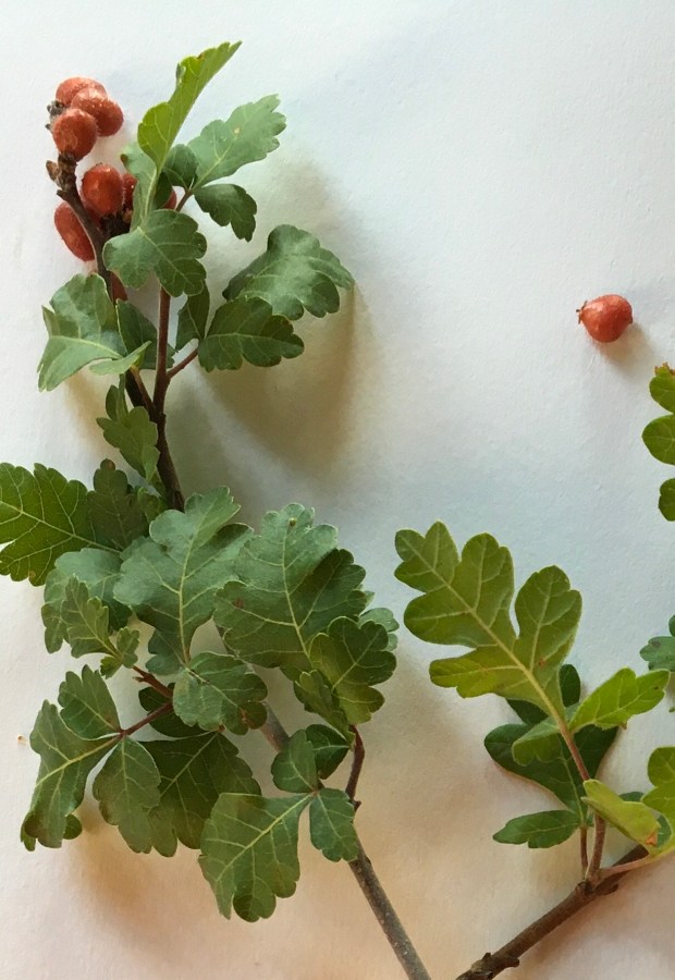 That was the question uppermost on my mind when a slight breeze wafting down the trail lifted a fresh oak leaf revealing four slightly wonky vase-shaped growths. One was squatty and pale; three were colored with alternating bands of cadmium yellow and deep vermillion. All four galls were attached to the underside of the leaf, hanging upside down, so whatever might’ve been inside is out.