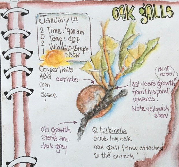 Here it is 2024, and while hiking the Albuquerque foothills, a new (to me) and colorful gall form appeared hanging beneath an oak leaf. My curiosity piqued. It was high time I gained some insight about the life cycle of cynipid gall wasps. Paraphrasing numerous expert sources, my attempt to interpret and understand what has been described the one of the most complicated life cycles known in the animal kingdom, still seems confusing. Maybe it’s been hard to wrap my mind around Parthenogenesis (asexual reproduction)***….. a key component of a cynipid gall wasp’s life cycle. By taking my time (over a month), and after many written and diagrammatic iterations, I stitched together a description that works. If you’re curious, read on!