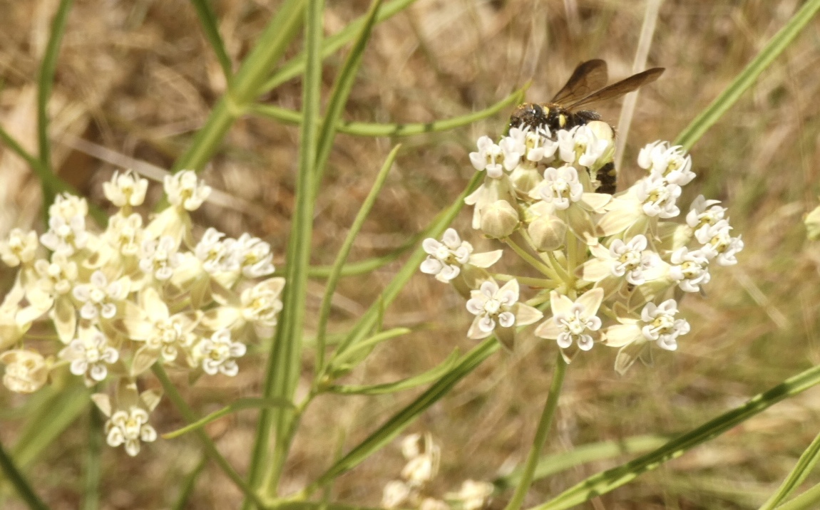 Wandering about the neighborhood one warm summer morning in 2018, I noticed a dense stand of plants lining a 20 foot section of road. What caught my eye were the umbrella-like clusters of pearly white flowers topping each slender stem. From a distance these plants resembled our native white-flowering yarrow. But I soon realized the narrow dark green leaves were not fuzzy; the tiny exotic-looking flowers were not daisy shaped. Unmistakably, this plant was a species of milkweed! And the flowers of more than 50 individual plants in this population were a-flutter and a-buzz and a-crawling with hungry insects!