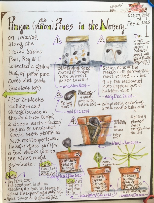 All of the germination and seedling development details of these piñon seeds, to date, can be found in my update illustrations.