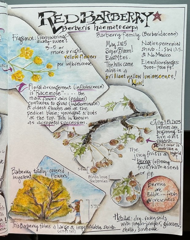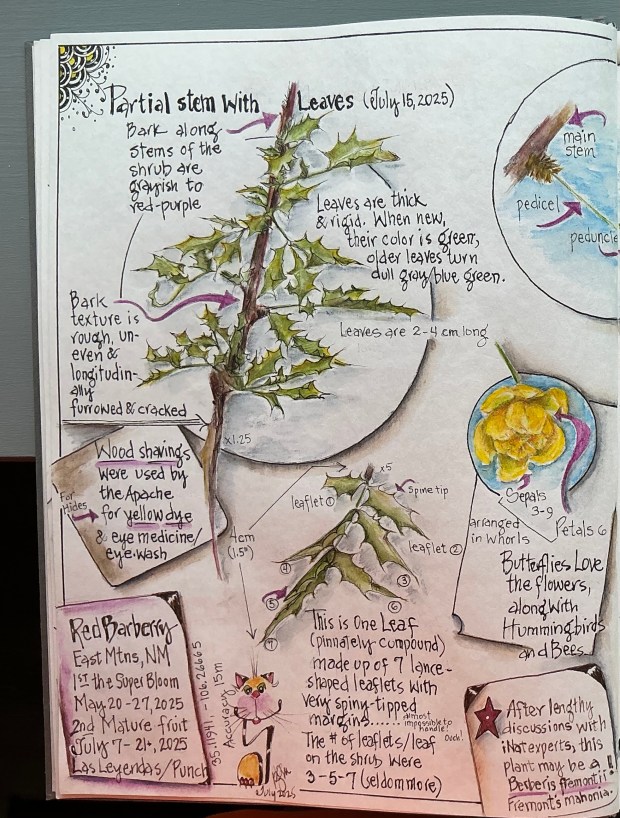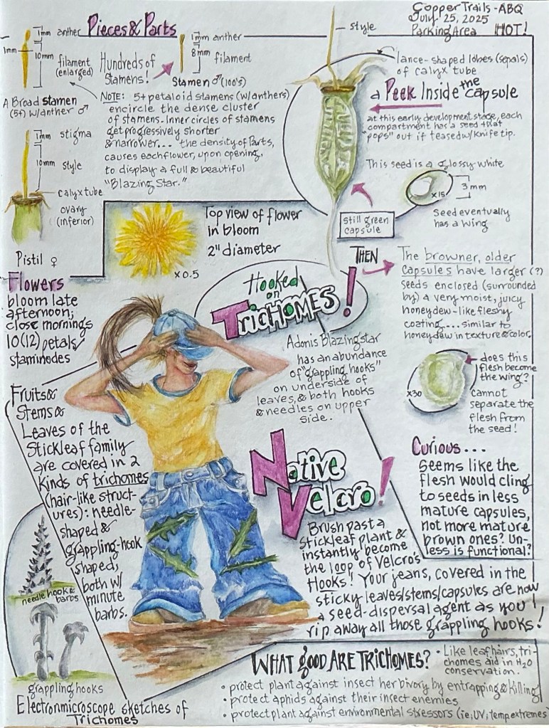 And now for the curious nature of the Mentzelia genus. When coming across the Adonis Blazingstar (Mentzelia multiflora) over the past 8 years, it’s been fun to inspect the leaves, remove one and intentionally stick it to Roy’s jeans or mine. I’ve then wondered how this plant ‘sticks’ so well, and why. The time for answers arrived this month, and what I learned was fascinating. It’s all about Trichomes.