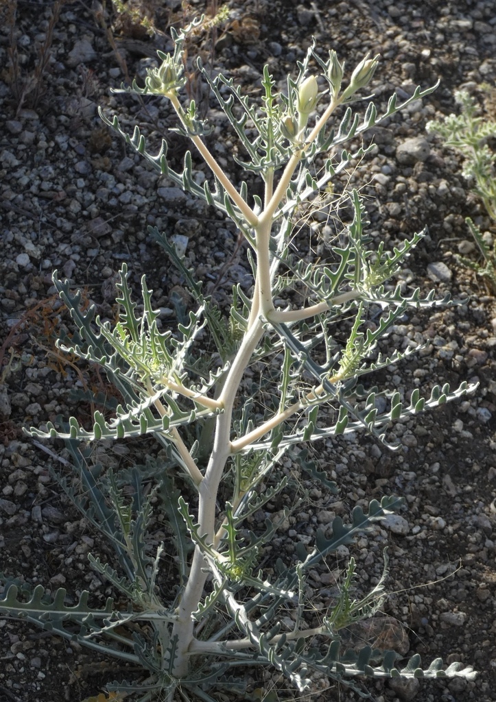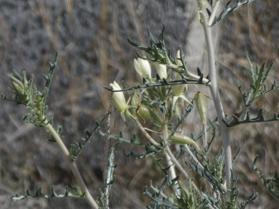 Trichome is a botanical term used to describe the small hair-like structures that occur somewhere on a plant; typically on plant leaves. Trichomes can be found throughout the plant kingdom (like on Cannabis sativa); they aren’t unique to the Stickleaf family, and are found on all species of the the Mentzelia genus. Some Mentzelia species have one type or shape of trichome; some have several types. Adonis Blazingstar has two types of trichomes – one is shaped like a grappling hook; one is shaped like a barbed needle. It’s the trichomes that grab on and hold tight. But what possible function do they serve the plant? Surely a leaf sticking to the fur of a passing animal or a person’s pant leg, while decorative, is otherwise pointless?