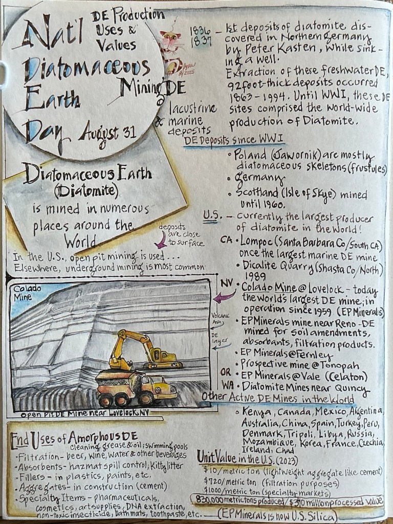 Have you ever heard of Diatomaceous Earth (DE)? If you answer “yes” then perhaps you brew your own beer, have a swimming pool in need of water filtration, or a vegetable garden that’s been invaded by a herd of hungry slugs. But did you know DE is a mineral1 composed of the fossilized remains of single-celled, microscopic algae called Diatoms? (More about diatoms in an upcoming post.) DE is truly a remarkable mineral, found around the world in ancient marine and lacustrine (freshwater lakes, streams, and rivers) sedimentary deposits.