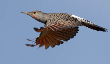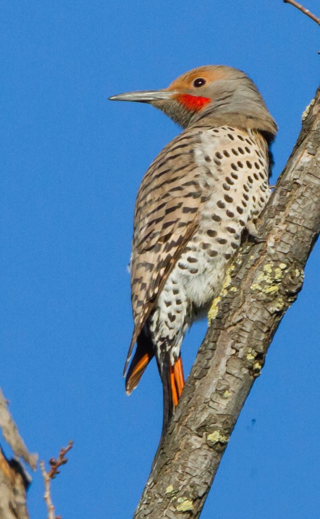 How do you know a Flicker has laid claim to your place? Well, he’s a big, heavy-bodied bird, and when flying overhead, your first thought might be “Crow!” At 12-14” long, with a wingspan of 18”-21”, the size is right. But as he flashes a large showy white rump patch bookended by reddish-orange underwings, you realize he’s not black. Anything but! As his flight slows and dips you notice his brown back is marked with narrow black bars. In preparation for landing, with wings open wide, he vertically aligns his body and feet with the wall, exposing a pale gray belly with bold black spots and a chest-wide black patch. Two strong clawed-toes up, two down (zygodactyl), and a stiff wedge-shaped tail adjusted as a brace, he taps out a few test spots, drawing your attention to his long and heavy bill, on a slate gray head broken by a buff-brown crown, a bright red whisker (male), and light gray cheeks.