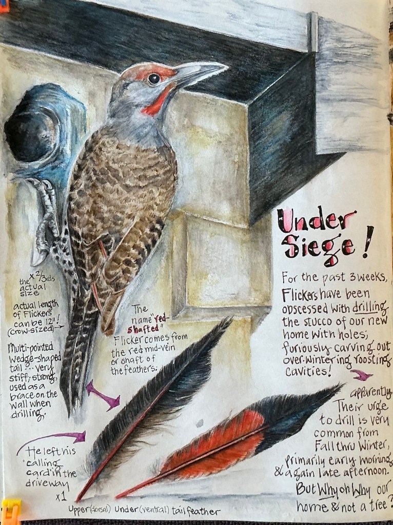 This bigger-than-life bird has landed, tested, and pecked away at his chosen spot 170 times in 10 seconds! He’s created an entry hole about 3” wide, right through the stucco and foam sub layer. This determined Flicker knows winter is coming and he intends to drill into our home, making a cozy roosting cavity in which to hunker down until Spring!