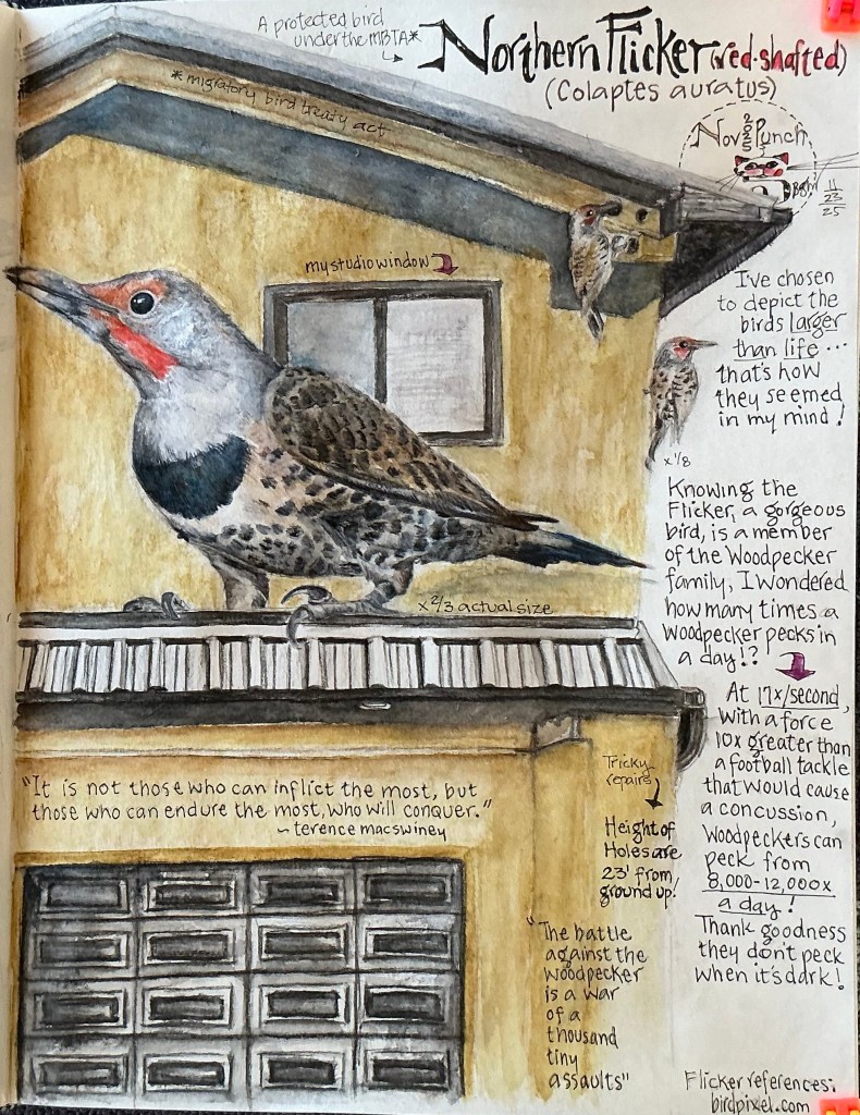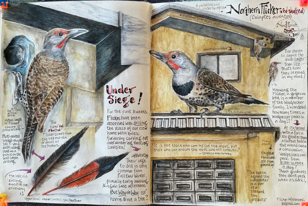 It’s already been repatched and resprayed, and while writing this story in my studio with window cracked and a clear view of the patched hole, I’m sure to hear and see that gorgeously determined Flicker if he returns to jackhammer away, once again, into a side of our home!