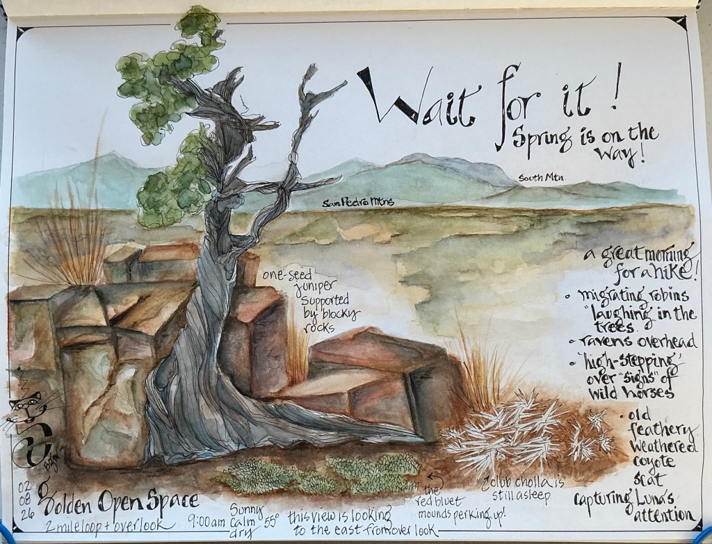 But ….. since Winter Solstice and with daytime hours lengthening, I’m ready for Spring. And the closer it gets, my impatience for the upcoming change in season is obvious. My nature journal, pencils and 10x magnifying loop are packed and ready, each daily hike begins by plucking from a yucca one of last year’s flower stalks to poke the ground for signs of growth, and I’m anxious to snap photos of any passing migrating bird or resident roadrunner in search of a perfect nesting spot.