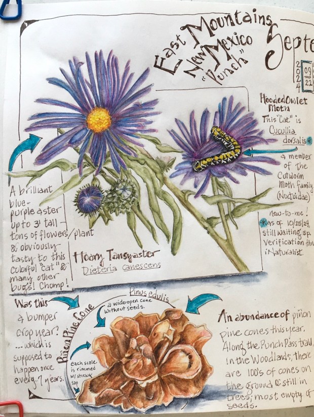 But plenty of hints of what was to come ….. the inevitable change in seasons ….. existed. There were seeds of spring and summer bloomers blowing in the wind; squirrels stockpiling pine nuts from recently shed cones; darkling beetles mating and laying eggs in the ground to hatch next year’s population; caterpillars feasting on energy-packed flower petals needed to spin their cocoons; the chortling chatter of sandhill cranes high overhead migrating to Bosque del Apache for the winter.