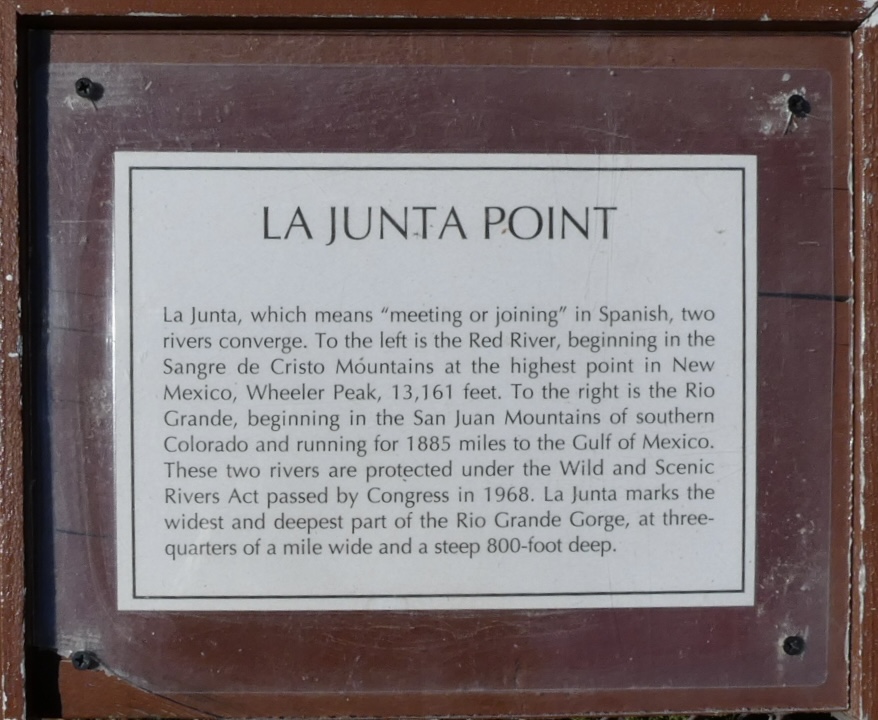The confluence of two of these rivers, the Rio Grande and the Red River, occurs in the northern Wild Rivers area of the Monument. It’s at this confluence where the gorge is its deepest at 800 feet, and its widest from rim to rim measuring 3/4 mile. It’s an impressive view from the la Junta (“the Meeting”) Overlook. All of the views from anywhere along the rim are impressive.