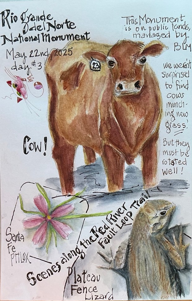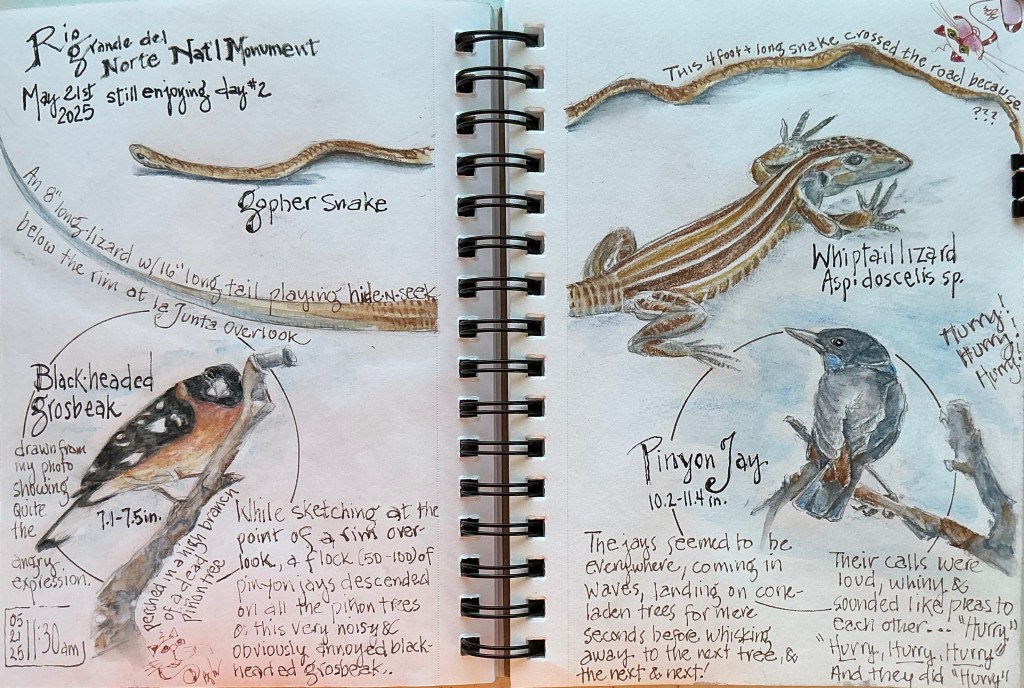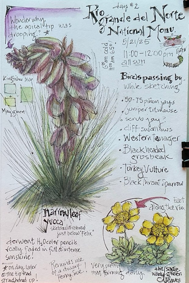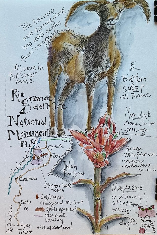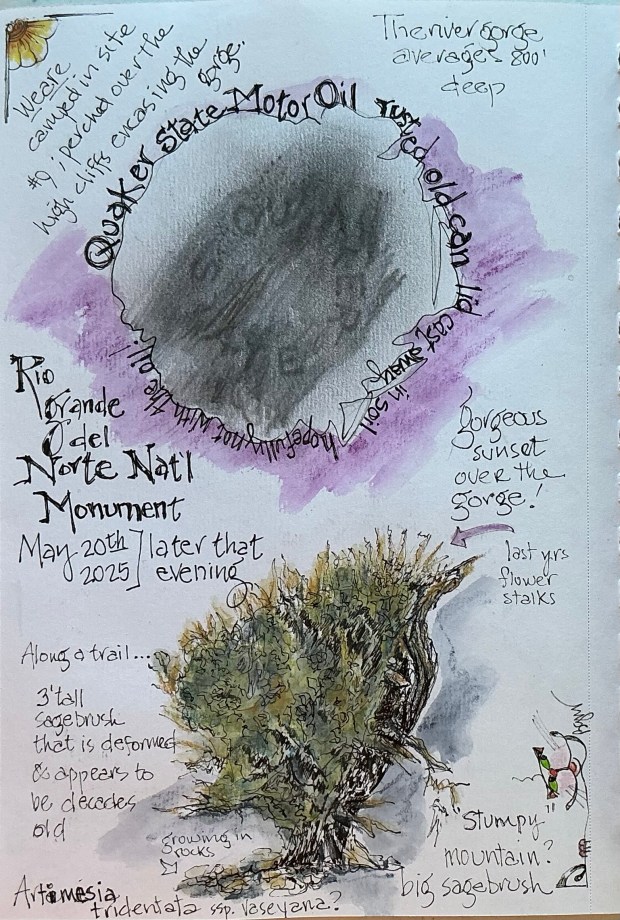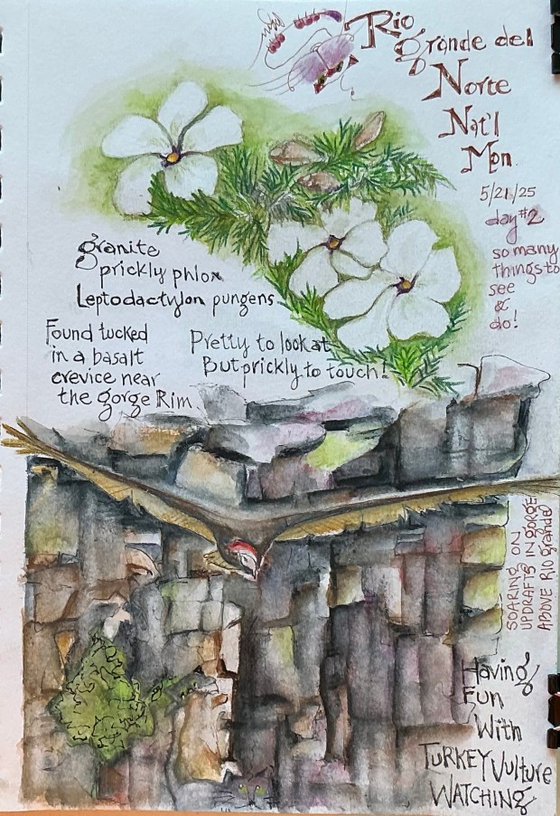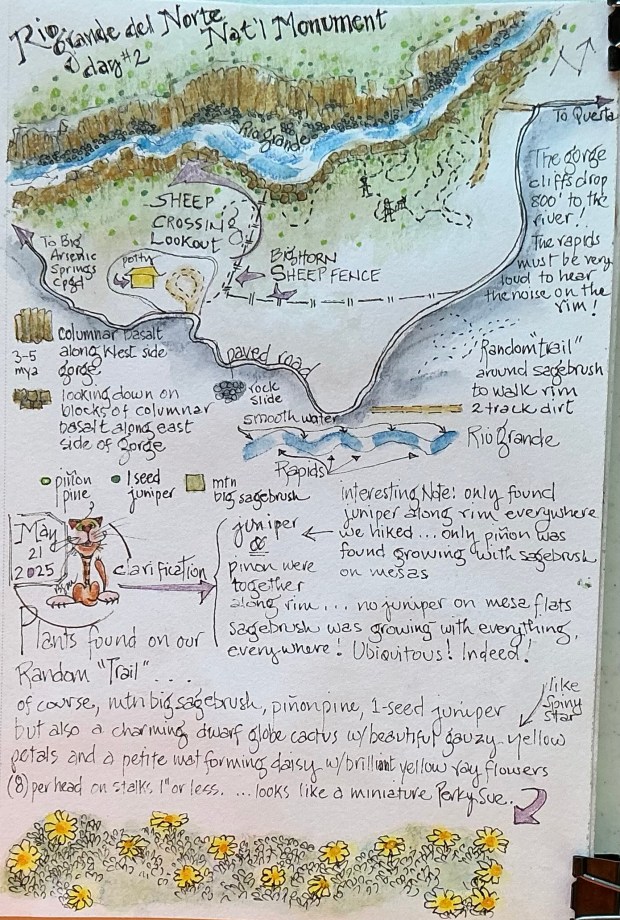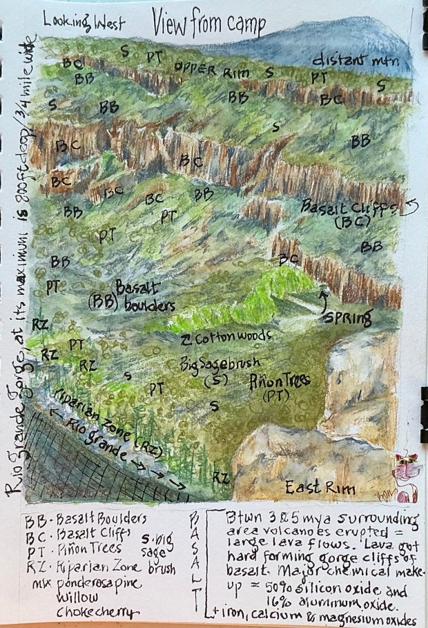 We backed our RV (‘Felix’) into what must’ve been the best designated camping site ever ….. #9 on the southern loop in Big Arsenic Springs Campground. After setting up, we discovered that Felix rested only a few steps west was the rim and the long plunge down to the Rio Grande! But immediately south of us, the rim formed a small peninsula where nearly every afternoon I could be found sketching the plants growing from the basalt cliffs, or the swifts and turkey vultures soaring along the cliffs and over the river aided by the canyon’s updrafts. This skinny little peninsula quickly became my favorite sit spot; then late one morning it became priceless …….