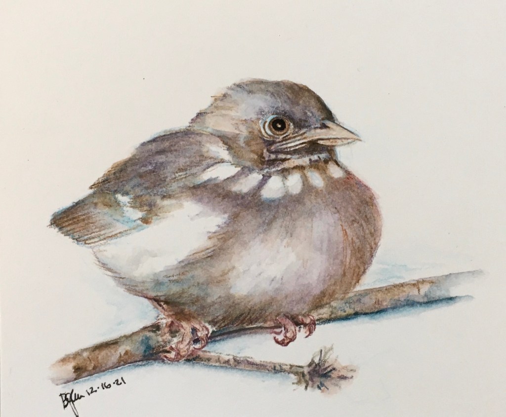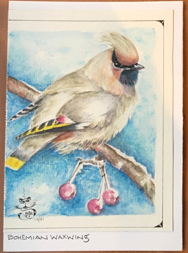 Bohemian waxwing, 4×6”, Watercolor pencil