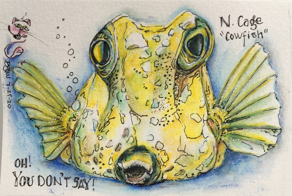 N. Cage Cowfish, 6×6”, Watercolor pencil and ink