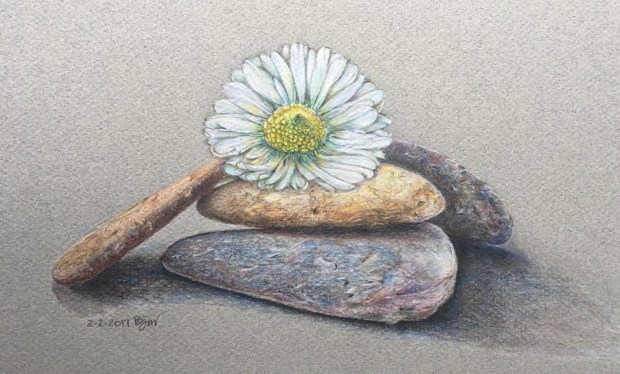Still life, Daisy on River Rocks, 6×8”, Colored pencil