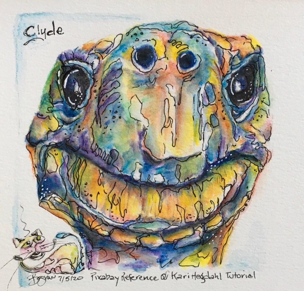 Clyde the tortoise, 4×4”, Watercolor pencil and ink