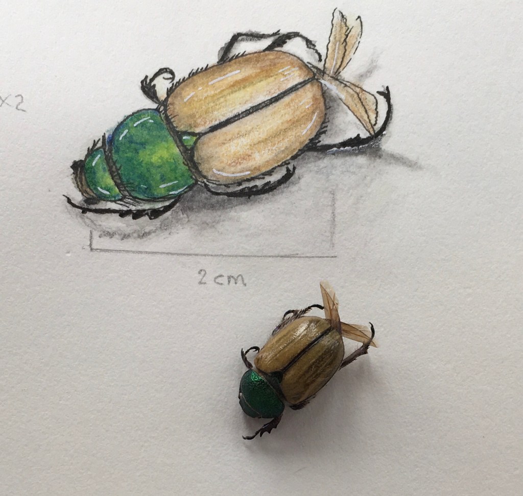 Punctate little bear beetle, 4×4”, Watercolor pencil and ink