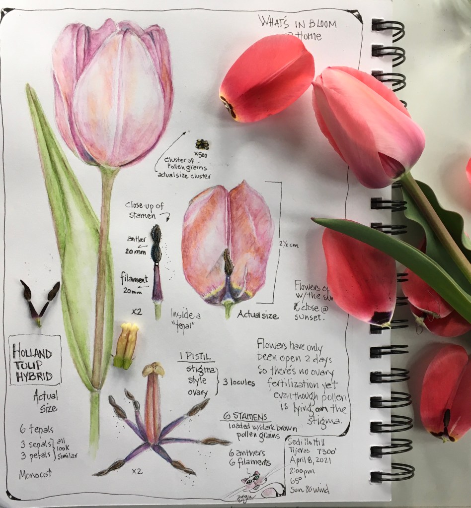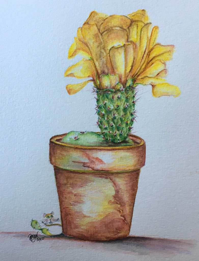 Potted cactus in bloom, 8×11”, Watercolor pencil