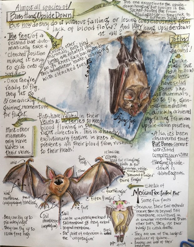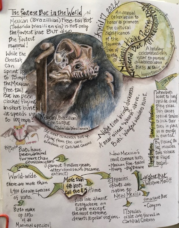 It would’ve been easy and fun to fill up the rest of my journal with bat facts and more Haiku, but because the celebratory date of both National Bat Appreciation Day and National Haiku Poetry Day has now come and gone, I had to stop. Maybe you’ll want to answer a bunch of your own questions about bats? Maybe you’ll want to write your own Haiku about bats in honor of this style of poetry?