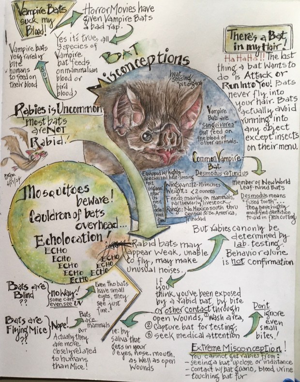 For this post, while exploring bats’ importance in the ecosystem, to science, and while recalling all of those Australian flying foxes I was curious about why and how bats hang upside down, the types of bats and their diets, and what adaptations Vampire bats have causing them to crave a diet of blood. Much of this rabbit-trailing led to myths and misconceptions about bats, then back to New Mexico’s most famous ‘out flight’ of the American Free-tailed Bat every spring, summer and fall evening from Carlsbad Caverns. While learning, several Haiku poems materialized reflecting bat behavior.